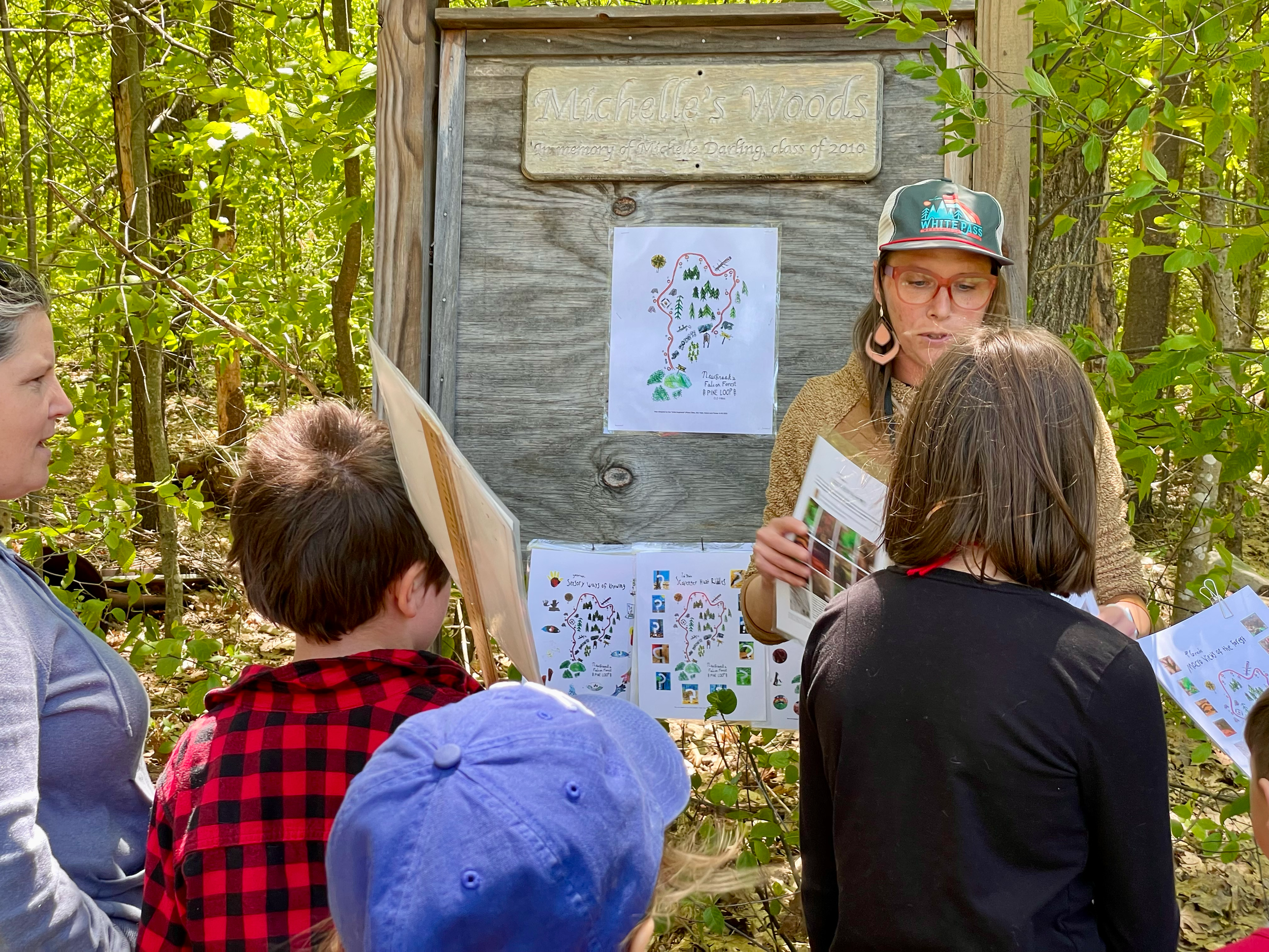The NewBrook School borders a beautiful forest. Two teachers were passionate about getting the kids to form a deep relationship with the forest and all of its inhabitants. They set out to create art and engagement that invited the whole community to explore the forest and its trails. After deciding on 18 unique spots long the trail, each grade created a map that drew the walker’s attention to a particular layer or perspective of the forest, creating a 5 special maps. The 2nd graders also co-created a land acknowledgement that welcomes everyone at the trailhead, based on poetry they wrote in the forest. On field day, the community came, chose one of the maps and walked the forest.